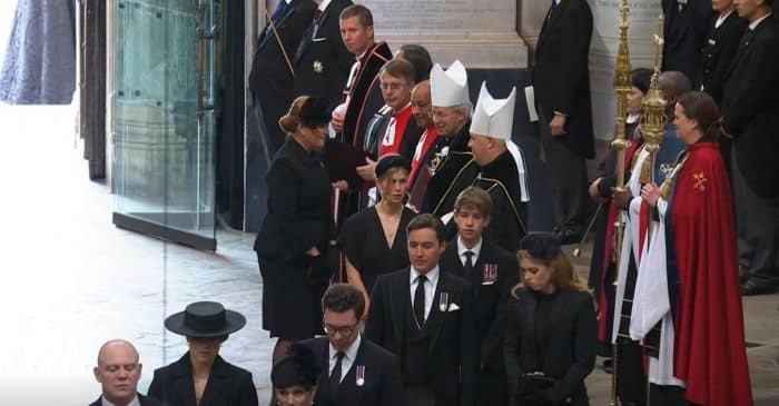 Prinses Beatrice volgden na de rouwdienst samen de rouwstoet in de auto. Tijdens de dienst was ook hun moeder, Sarah Ferguson aanwezig. Ze zat in de kerk bij prinses Eugenie en haar man Jack. Prinses Beatrice droeg vandaag een eerder gedragen kort jasje van The Kooples op een nieuwe zwarte jurk van Preppy Martingale. Haar hoed komt van Sarah Cant Millinery. Haar zusje, prinses Eugenie, droeg een zwarte wollen mantel van Day Birger et Mikkelsen.