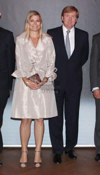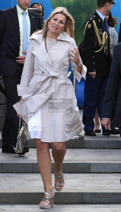 In 2004 bestelt Máxima twee robe manteaus (jasjurken) bij het Belgische modehuis Natan. Het model en de stof komen overeen, alleen de kleur verschilt. Hier zien we de lichtgrijze variant, met een breed ceintuur, brede kraag en brede manchetten. Benieuwd naar de rode? Klik dan hier.