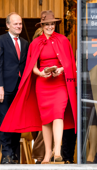 Deze bloemenprint siert onze majesteit niet echt. De jurk is te lang. Ideetje inkorten tot midi? en een mooie zwarte riem dragen?
