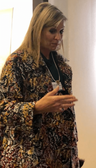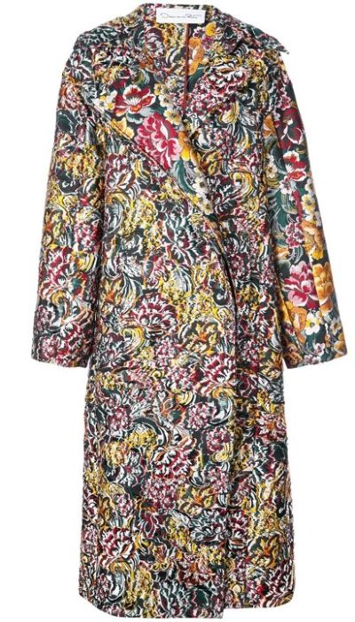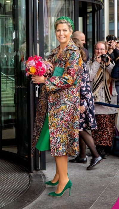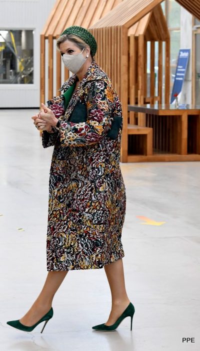 Vlak voor de coronapandemie ons land stillegt, schaft Máxima een kleurrijke, brokaten bloemenmantel aan van Oscar de la Renta. In 2020 en 2021 komt de mantel meermaals in beeld.