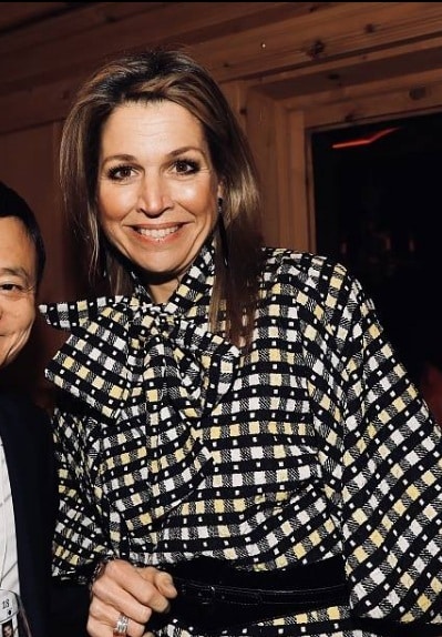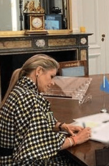 In Máxima’s kledingkast hangt een blouse met een royale strikkraag van Duro Olowu. Omdat de koningin hem voornamelijk privé draagt, hebben we er helaas weinig beeld van. Wel weten we dat ze er een matchende rok bij heeft gekocht.