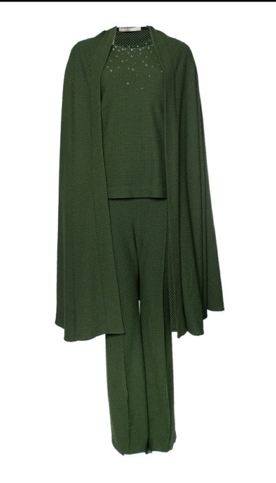 De kleur groen vind ik mooi, Verder een heel rommelig pak en een griezelige broche met die tor.