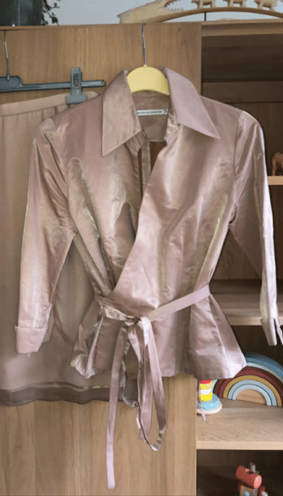 Als Máxima in 2003 voor het eerst de Appeltjes van Oranje mag uitreiken, zijn alle ogen gericht op haar buik. Is ze zwanger, of is ze dat niet? Over haar aansluitende, kanten jurk van Natan besluit de prinses een champagnekleurige blouse van hetzelfde modehuis te dragen. In 2006 combineert ze laatstgenoemd kledingstuk met een broek in dezelfde tint en in 2013 mag hij nogmaals dienst doen op een avondjurk. Hoewel het modehuis er ook een bijpassend ceintuurtje bijlevert, sluit Máxima de blouse alle keren met een broche.