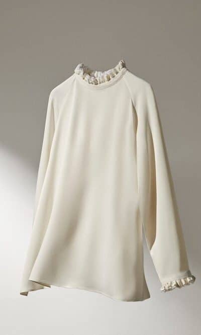 Een witte blouse kan bijna overal bij. Dit ontwerp van Massimo Dutti heeft Máxima gedragen bij een donkerblauwe culotte (Natan) en een geruite plooirok (Natan). Voor een feestelijk effect zijn er de halslijn en manchetten ruches aangebracht.