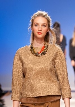 Rond 2011 bestelt Máxima bij NATAN een driedelige set. De zilver-grijze rok heeft zes verticale banen, gemaakt van drie verschillende stoffen. De goudkleurige top en mantel zij gemaakt van zijde met ingeweven reliëf.