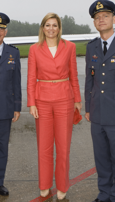 Als Máxima haar hart verliest aan de Nederlandse kroonprins, is ze werkzaam in het bankwezen van New York. Passend bij deze carrière, hangt haar kast vol met broekpakken. Eenmaal in Nederland aangekomen, blijft ze deze stijl nog geruime tijd trouw. Dit felrode broekpak, waarvan de maker nooit is achterhaald, wordt in 2001 aan haar garderobe toegevoegd. Het debuut van de complete set had moeten plaatsvinden in juli 2001. Omdat Máxima’s been op dat moment in het gips zit, valt haar keuze op een andere, ruimere broek in een zachtere tint. In november 2001 komt ook de broek van het broekpak in beeld tijdens een vakantie in Argentinië.