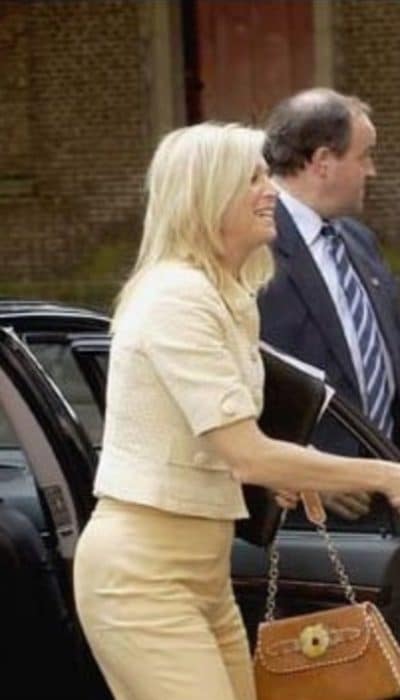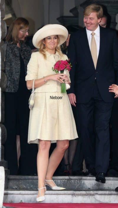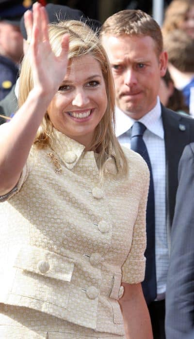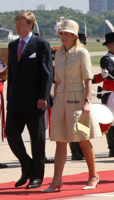 In de eerste jaren van het nieuwe millenium liet modeontwerper Edouard Vermeulen van Natan zich volop inspireren door de kleding van Jackie Kennedy. Lees: korte jasjes, monochrome ensembles en grote knopen. Het setje dat Máxima droeg bij de afsluiting van het staatsbezoek aan Argentinië is daar een goed voorbeeld van. Het jasje is voorzien van tien grote, beklede knopen. Twee op de mouw, twee op de kraag, twee op de zakjes en vier middenvoor. De stof met een werkje is ook gebruikt voor de rok met kenmerkende Natan-plooien.