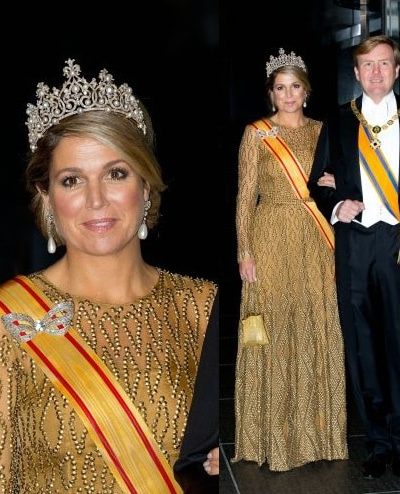 Voor haar eerste Prinsjesdag als echtgenote van de koning bestelt Máxima bij Jan Taminiau een goudkleurige japon met transparante mouwen en een riempje in de taille. De gehele robe is voorzien van een geborduurd degradé wyber-patroon met verschillende lagen pailletten en glaskralen, die de jurk een driedimensionaal effect geven. Bij de japon draagt Máxima een bijpassende hoed van goudkleurige sinamay. Een ontwerp van Fabienne Delvigne.