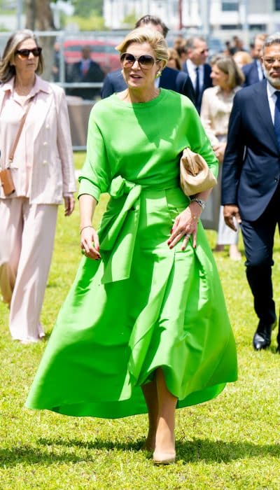 Voor Koningsdag 2023 schaft Máxima een toepasselijke set aan bij NATAN. Groen-wit, de kleuren van de Rotterdamse vlag, komen er beiden in terug. De top met boothals en aangeknipte, korte mouwen is gemaakt van gerecyclede zijde. De overslagrok heeft een asymmetrische lengte en is bij de taille voorzien van een grote strik.