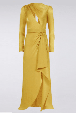 Het split vind ik vreselijk. Je kunt met geen mogelijkheid normaal zitten met zo’n hoog split, de zijkant van de jurk valt zo ongeveer tot de heup naar beneden, of je moet de diverse panden bij het zitten over elkaar heen gaan draperen (maar dat ziet er helemaal gek uit).