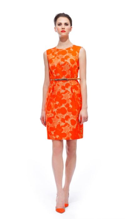Mouwloze jurk met ingeweven dessin en typerende stolpplooien. Een ontwerp van Natan.