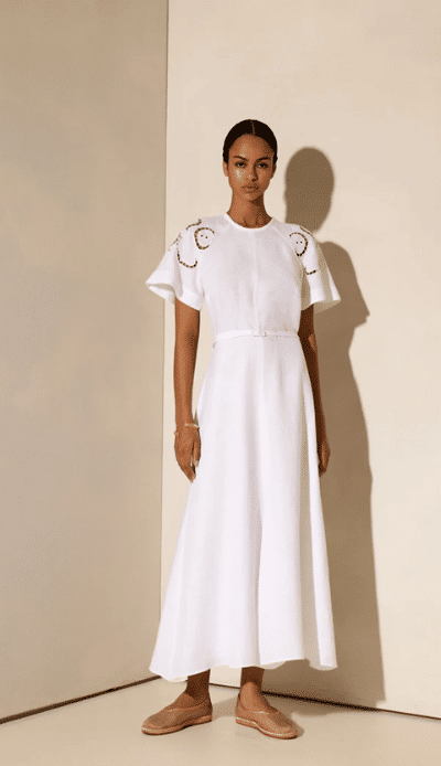 Als prinses Ariane voor de strijd tegen ALS in de Amsterdamse gracht zwemt, komt trotse moeder Máxima kijken. De witte jurk met doorkijkjes die ze dan draagt, komt van het Griekse label Ancient Kallos.
