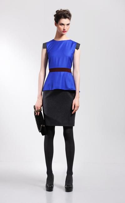 Rond 2012 zijn peplums je-van-het. Máxima schaft – onder andere – een kobaltblauwe aan bij modehuis Natan. Het kledingstuk is mouwloos en voorzien van grijze schouderpassen. Hoewel het kledingstuk ook prima met een pantalon dienst kan doen, kiest Máxima steevast voor een rechte, grijze rok.