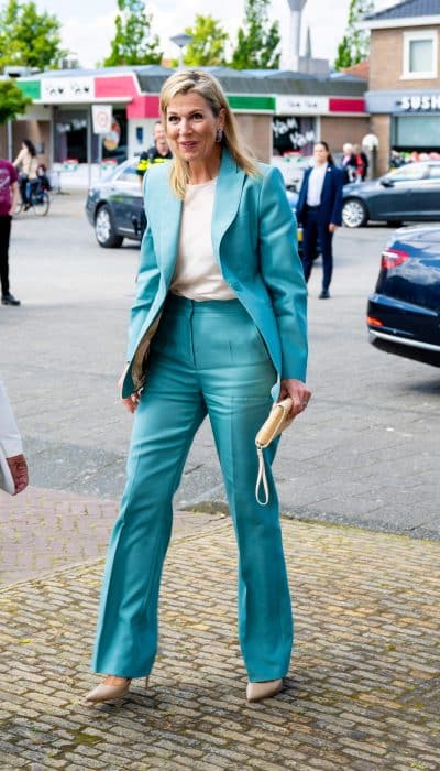 Mooi pak! Hele mooie kleur en ein-de-lijk eens niet zo’n hobbenzak-model broek. Een beetje jammer dat Maxima niet helemaal op de foto staat, maar ik vind het een goed pak