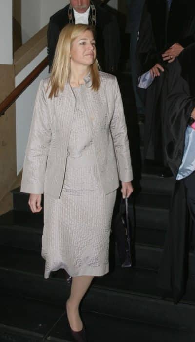 Als Máxima in januari 2001 voor het eerst in de openbaarheid verschijnt, draagt zij een pak waar de tuttigheid vanaf druipt. Het ontwerp bestaat uit een losvallende jurk tot over de knie en een boxy jasje. Beide kledingstukken zijn voorzien van verticale stiksels. Wie de maker is, is helaas niet bekend.