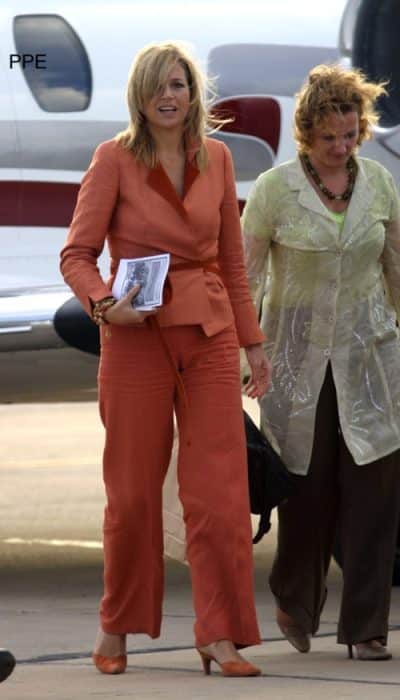In 2004 bestelt Máxima bij modehuis Natan een broekpak in de toepasselijke kleur oranje. Het jasje is bij de kraag en ceintuur voorzien van suède, wat zorgt voor een mooie vorm van diepte. Naast de zijde broek met wijde pijpen, die de prinses draagt bij het debuut van de set, bestelt ze er ook een broek bij in de kleur van de kraag en ceintuur.