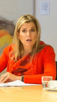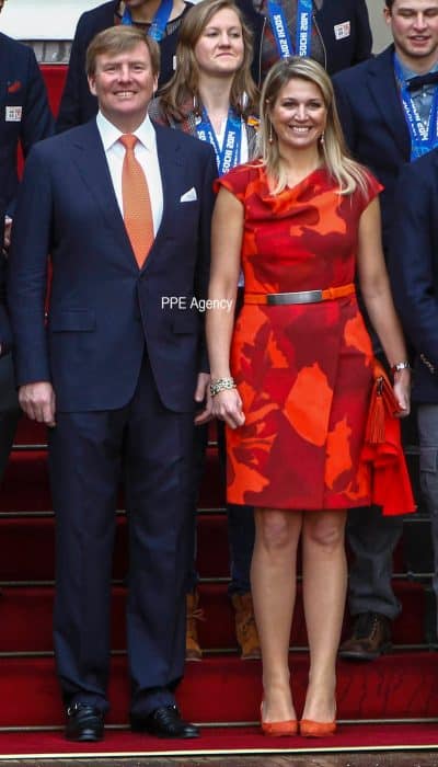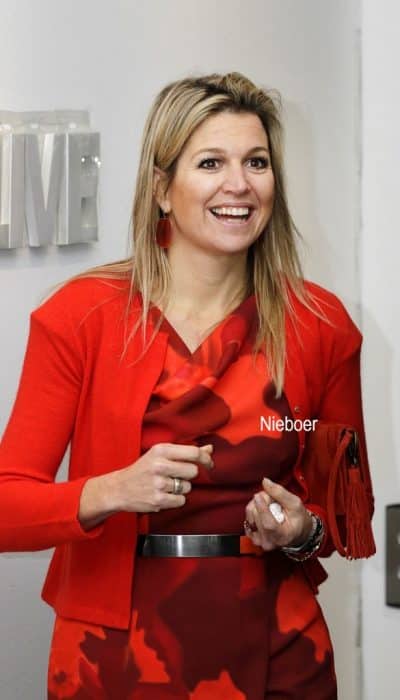 Kort voor de inhuldiging bestelt Máxima bij modehuis Natan een oranje-rode jurk. Het ontwerp heeft een watervalhals en een overslag bij het rokgedeelte.