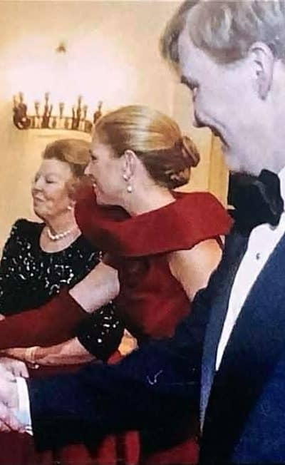 Rond 2002 is de omgeslagen kraag hét handelsmerk van Natan. Máxima zien we er meermaals mee, onder andere bij dit rode avondtoilet. Ruim vijftien jaar later zien we er Máxima nogmaals mee tijdens een diplomatendiner, dus tijdloos is hij zeker.