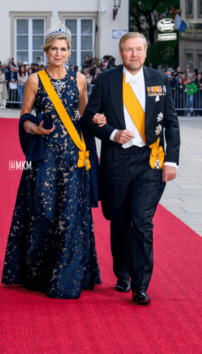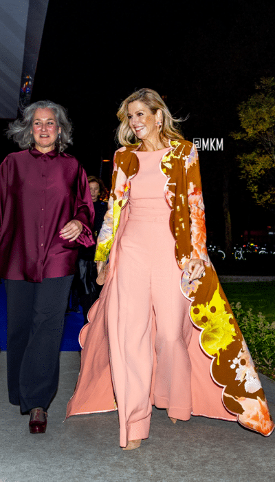 Tegenwoordig struikel je er bijna over, maar als Máxima in juni 2006 een roze broekpak debuteert, staan de zaken er heel anders voor. Koninklijke jurken domineren het modebeeld, broekpakken zijn uit. Gelukkig houdt dat de prinses niet tegen om deze poederroze set aan te schaffen en ook daadwerkelijk te dragen. De blouse, broek en blazer verschillen van stof. Door de overeenkomende kleur, oogt het toch als een geheel. Ontwerper: Vermeulen van Natan.