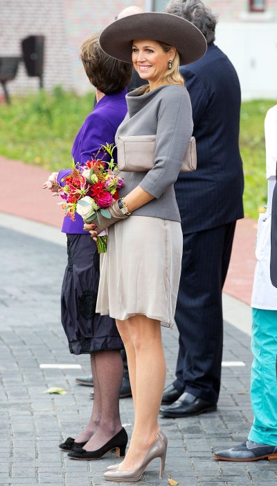 Vlak voor voor de inhuldiging bestelt Máxima bij modehuis Natan een top van zware wol. Door de stofkeuze valt de watervalhals heel gracieus. Een rechte rok met pailletten maakt het plaatje af.