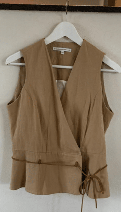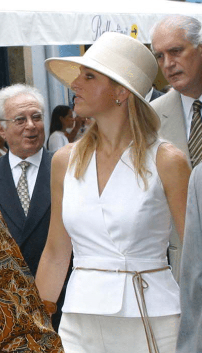 In 2003 durft Máxima de grenzen van de koninklijke mode wat meer op te zoeken. Dat blijkt ook uit haar keuze voor mouwloze tops. Dit gilet, met een smal riempje om de taille, koopt ze bij modehuis Natan.