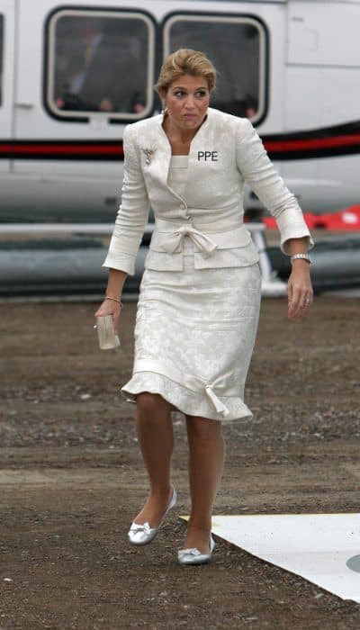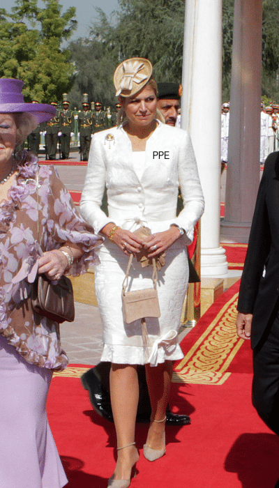 Voor de doop van prinses Amalia bestelt Máxima bij modeontwerper Valentino een op maat gemaakt mantelpak. De set bestaat uit een jasje met een strikceintuur en dubbellaagse peplum. De rok heeft eveneens een horizontale band met strik.