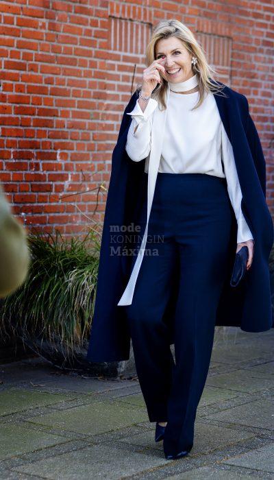 Als Máxima in februari 2026 een werkbezoek brengt aan Feijenoord, draagt ze een donkerblauwe broek en een witte blouse met losse sjaal. Het betreft een outfit van Natan.