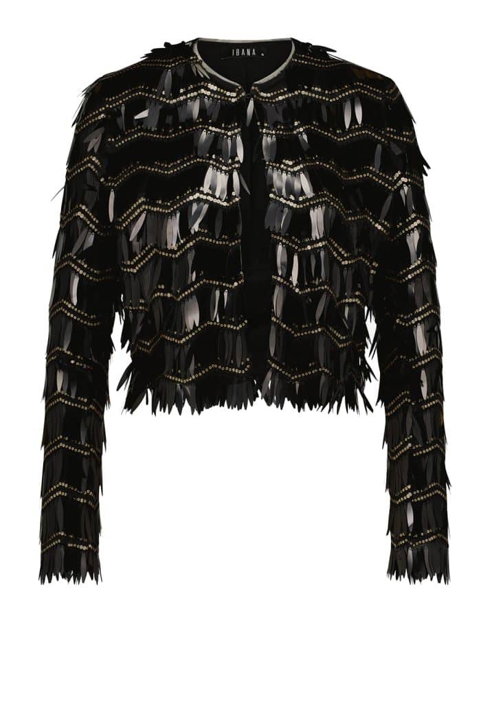 Beatrix’ nichtje Margarita draagt een zwarte broek, aquablauwe top met daarop een zwart jasje met pailletten en zigzagpatroon (label: Ibana).