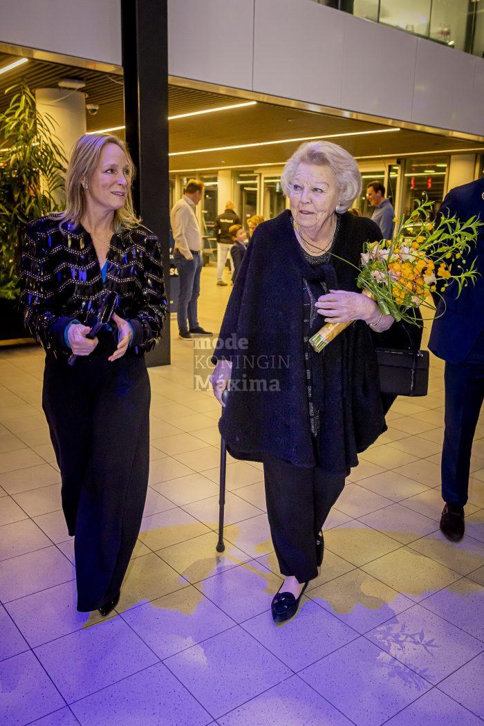 Prinses Beatrix draagt voor de gelegenheid een zwarte broek, met een top en een jasje, wat door haar donkere cape helaas niet goed zichtbaar is.