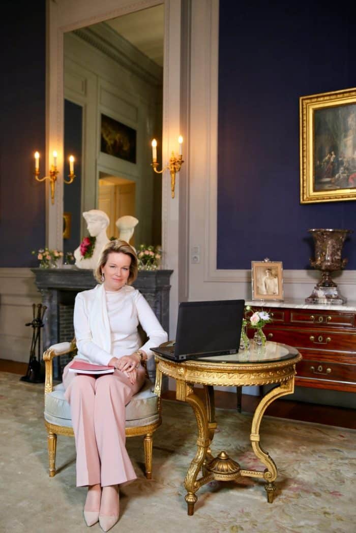 Koningin Mathilde droeg een witte top met sjaalkraag, die ze deze keer naar achteren had geslagen (label: Modehuis Natan), op een geruite grijze broek met pailletten (ontwerp: Modehuis Natan).