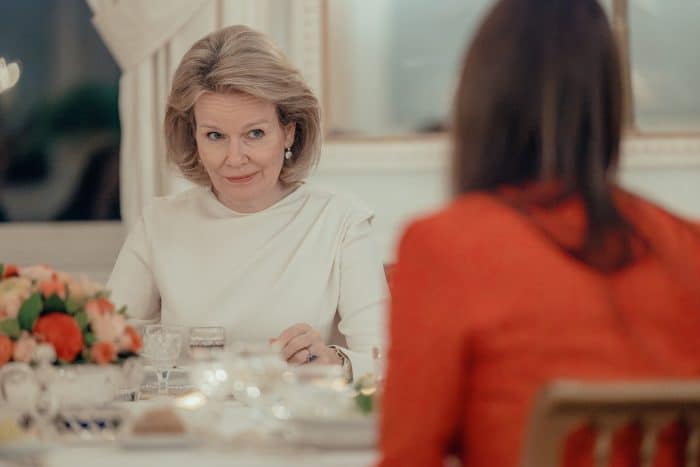 Koning Filip en koningin Mathilde dineerden gisteren met jonge journalisten in het Kasteel van Laken. En dat deed Mathilde in stijl.