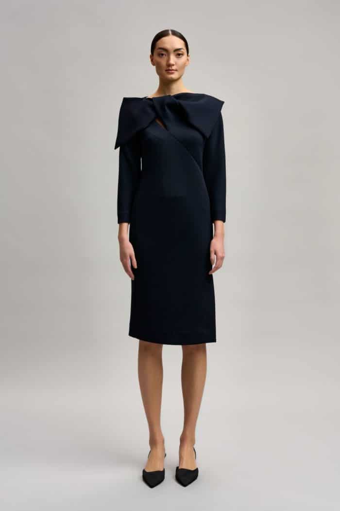 Wat opvalt aan de jurk met strik is de lelijke, openvallende en ongelijke split terwijl ze stilstaat. Foei!🫣