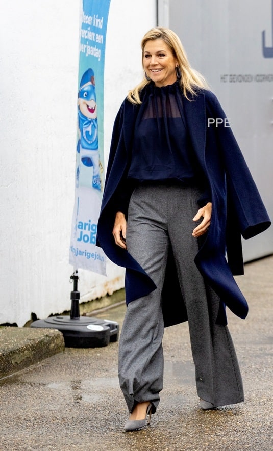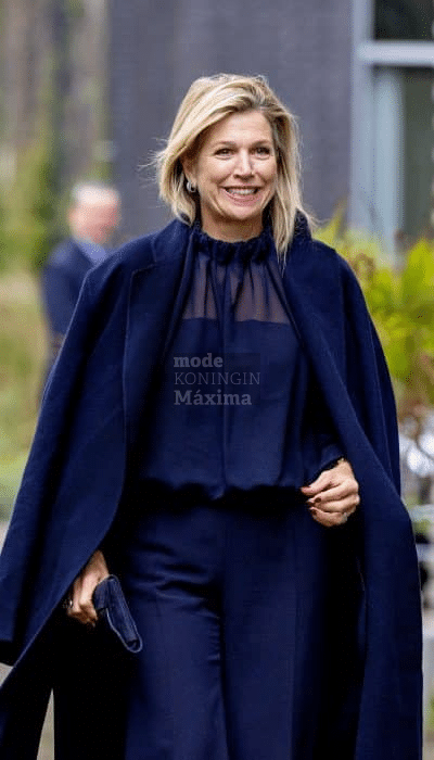 De blouse is een mooie kleur, echter die aangerimpelde halslijn, altijd al een hekel aan gehad. Het staat wat goedkoop, laatst las ik hier dat iemand dit vergeleek met een C&A-tje, niets mis mee natuurlijk maar ik vond het wel treffend. Die grijze wijde broek doet niets voor haar, kleuren staan Máxima beter, waarom niet dezelfde kleur blauwe broek erbij aangetrokken zoals op de foto. Een kleurtje op de lippen zou al een hoop schelen, de boel wat kleuriger maken ☺️. Beetje sombertjes zo.