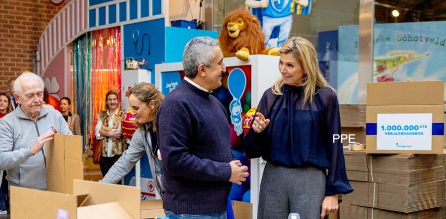 Koningin Máxima had vanmiddag een feestelijke afspraak in haar agenda staan; bij Stichting Jarige Job pakte zij de miljoenste verjaardagsbox in.