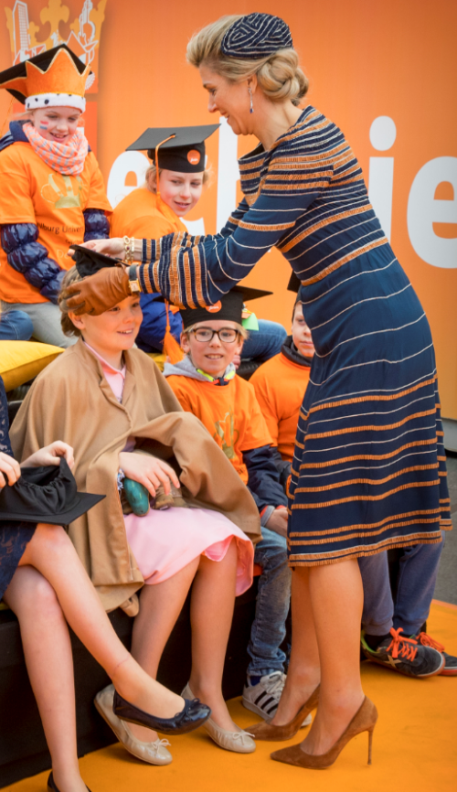 Outfit: op de tweede dag van haar verblijf in China draagt koningin Máxima haar outfit van Koningsdag 2017: een donkerblauwe cape van chenille met een rauwe, wollige en matte uitstraling, die in contrast staat met de overloop naar een glanskatoen in oker, met een glanzende en gladdere textuur. Onder de mantel draagt de koningin een donkerblauwe jurk, die is gemaakt van een combinatie van zijde crêpe Georgette en organza. In een degradé om het lichaam heen zijn donkerblauwe en okerkleurige gesmokte ribbanden, smalle metalen kettingen en kristallen geborduurd. En wie borduurwerk zegt, zegt Jan Taminiau.