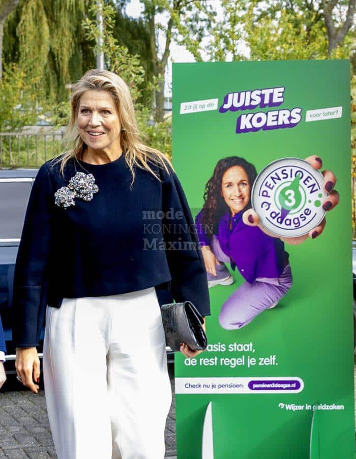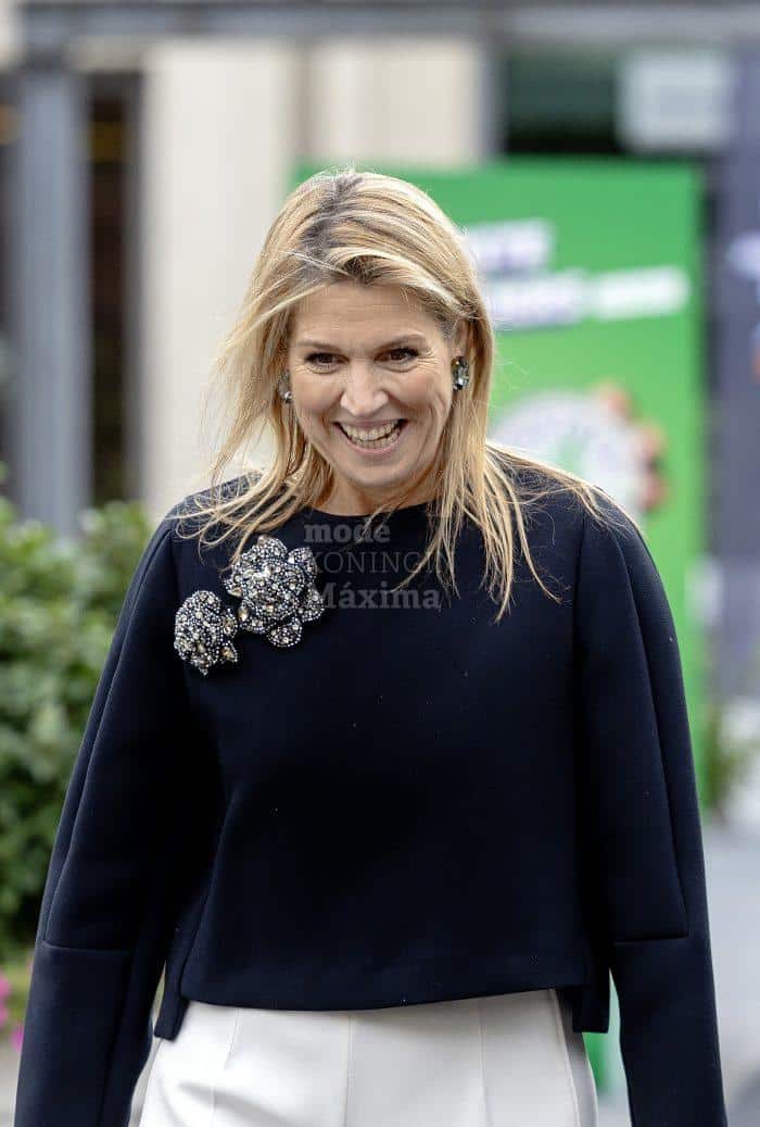 Koningin Máxima droeg een kort model zwarte top van dubbelzijdige crèpe (label: Modehuis Natan) op een offwhite pantalon, die vermoedelijk eveneens van Natan afkomstig is. In tegenstelling tot de vorige keer, lijkt de top vandaag meer donkerblauw dan zwart te zijn, wat misschien ook komt door het verschil in de broches. Op de top prijken nu twee glinsterende broches (naar de ontwerper wordt nog gezocht). Máxima’s zwarte clutch komt van Carlend Copenhagen. De clutch is geliefd, hij is al heel wat keren gedragen.