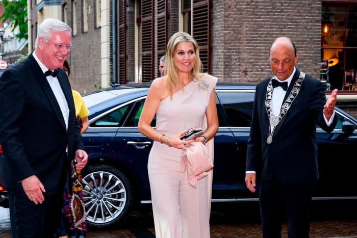 Koningin Máxima draagt een nieuwe jumpsuit van Natan Couture, de Ophelia jumpsuit in heel zachtroze/beige.