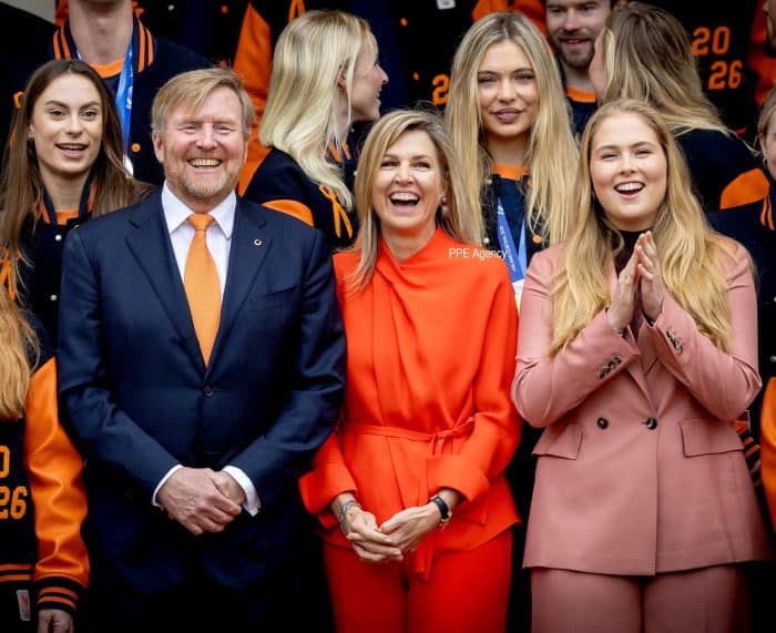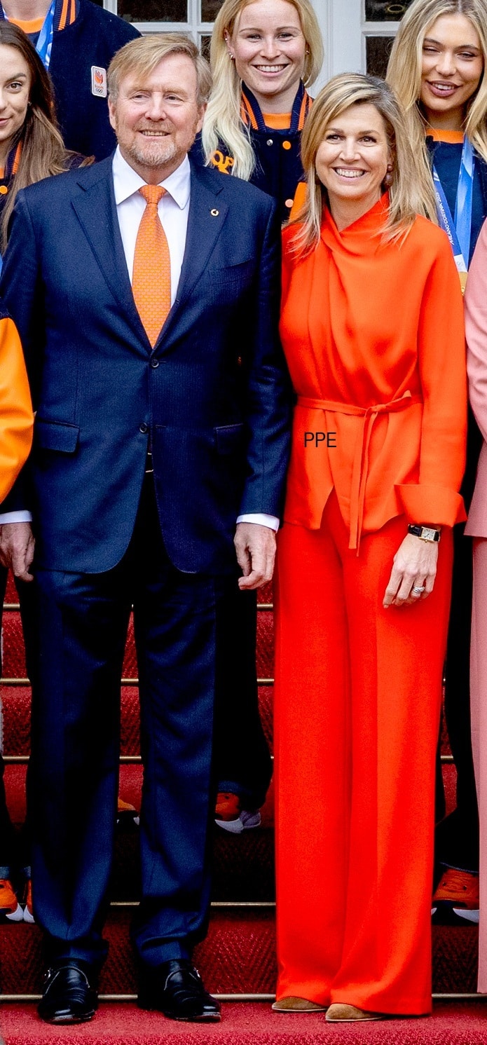 Máxima omlijstte het feestelijke moment met een nieuw, felrood broekpak van modehuis Natan. Ik moet zeggen dat ik hem erg leuk vind, met die bijzondere halslijn. En de koning? Die draagt uiteraard een oranje stropdas.
