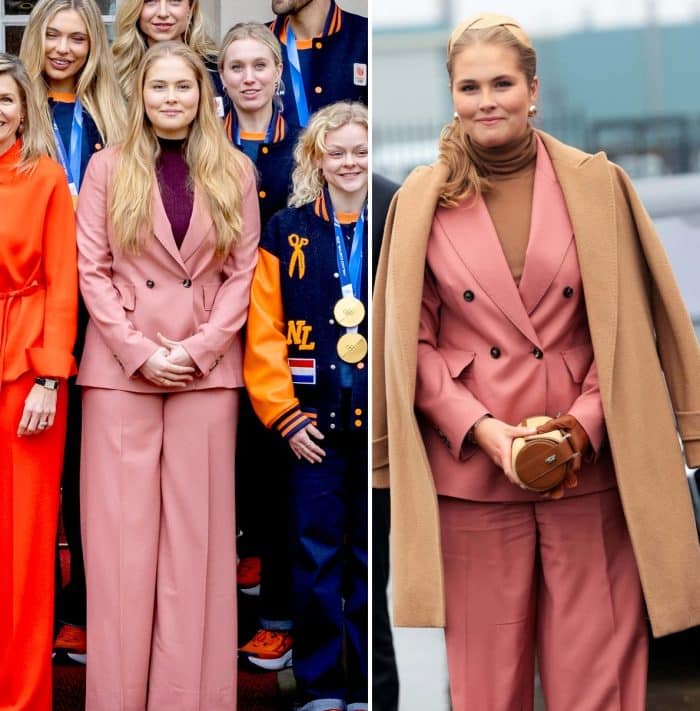 Voor de ontvangst trok Amalia een bekend broekpak aan. De set van Max Mara deed eerder dienst tijdens een herdenking in Griekenland en Amalia’s allereerste scheepsdoop. Waar ze hem de vorige keer combineerde met camel, viel de keuze dit keer op aubergine.