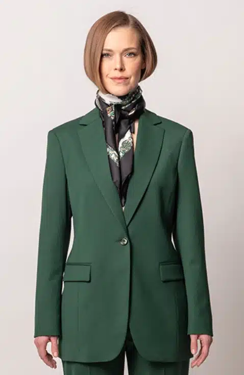 Een mooi pak in een mooie kleur. Zo’n, nu hip, sjaaltje had ik ook eens graag gezien. Een bloes met V-hals komt niet echt tot z’n recht.