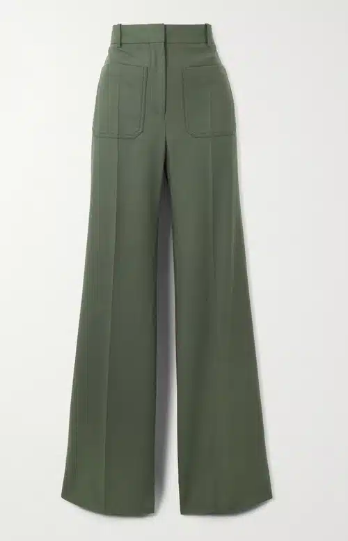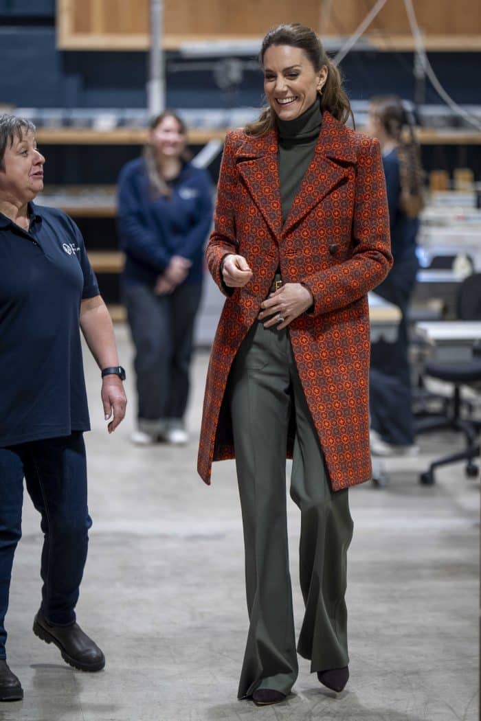 Zoals hierboven beschreven, droeg Catherine een mantel, die is gemaakt van een vintage Welsh tapijtstof met rozenpatroon uit de jaren ’60. Haar khaki trui van cashmier is afkomstig van N. Peal en haar oregano-kleurige broek is afkomstig van Victoria Beckham.