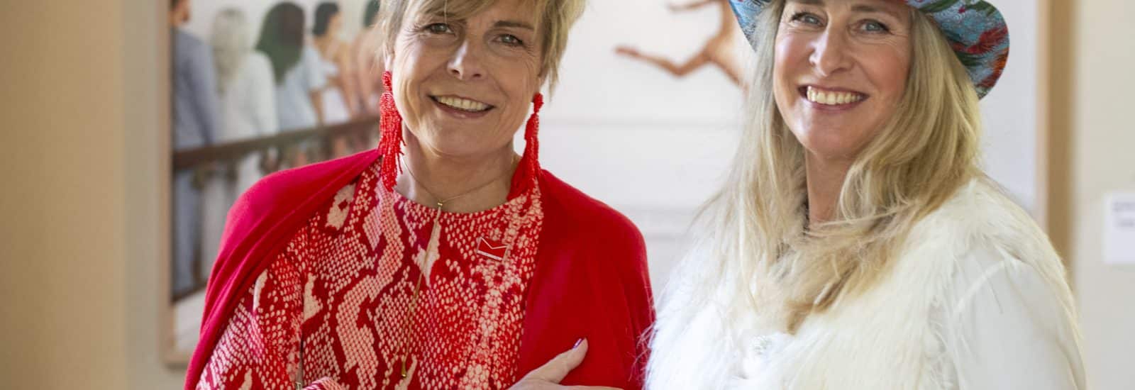 Laurentien in rood bij tentoonstelling Sym-me-try in Paleis Soestdijk