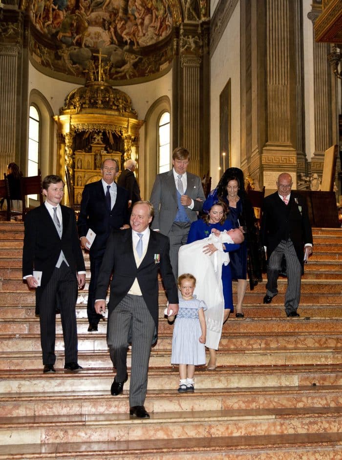 Willem Alexander met zijn petekind op de arm bij de doopplechtigheid.