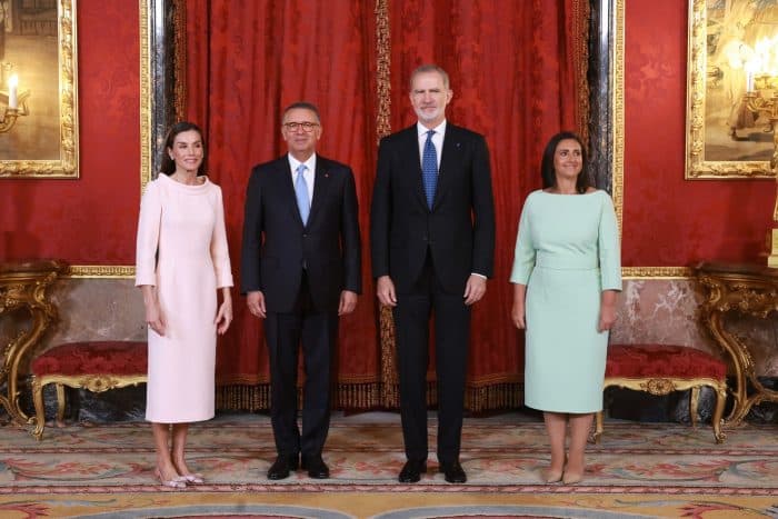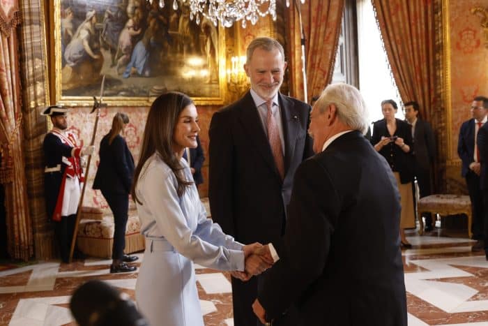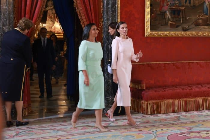 Daarnaast ontving het Spaanse koningspaar afgelopen maandag de president van de Portugese Republiek, António José Seguro, samen met zijn echtgenote. Zij brachten een officieel presentatiebezoek aan Spanje. Letizia koos hier voor een lichtroze japon van onbekende ontwerper. Haar handtas en slingback pumps zijn afkomstig van Carolina Herrera.