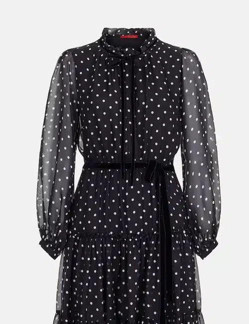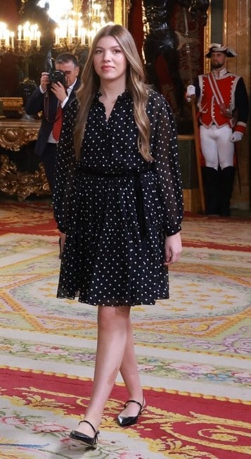Infanta Sofia koos voor een zwarte stippenjurk van Carolina Herrera, met een zwarte capemantel, eveneens afkomstig van Carolina Herrera. Ze draagt slingbacks met een hak van slechts 1 cm (label: Magrit).