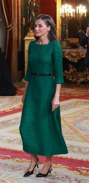 Koningin Letizia ging gekleed in een groene tweedjurk (ontwerper: onbekend) met een smalle zwarte riem van Hugo Boss. Haar zwarte slingbacks komen van Massimo Dutti en Letizia’s tas komt van Carolina Herrera.
