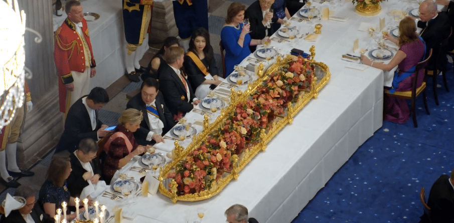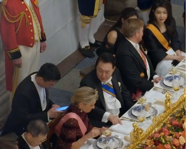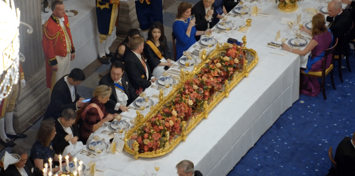 Een staatsbanket duurt al snel een uur of twee. Als je dan al die tijd naast iemand zit die jouw talen niet beheerst, dan wordt het een ongemakkelijke toestand. Zeker als je koningin bent en jouw gast op zijn of haar gemak moet stellen. Gelukkig spreken de meeste regeringsleiders een aardig mondje Engels, maar er zijn natuurlijk altijd uitzonderingen. In zo’n geval wordt er silmutaanvertaling geregeld. Een tolk vertaalt dan vrijwel gelijktijdig met de spreker. Een mooi voorbeeld hiervan kregen we te zien tijdens het staatsbanket voor de president van Zuid-Korea.