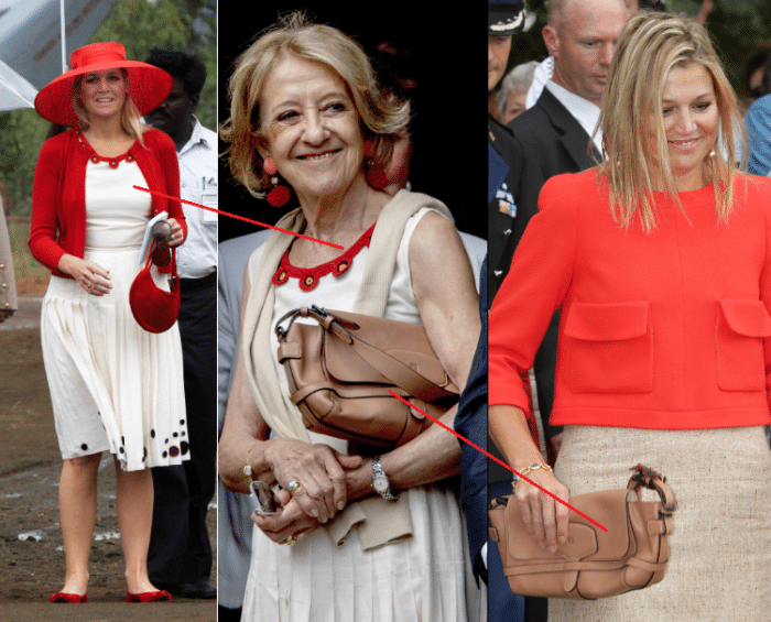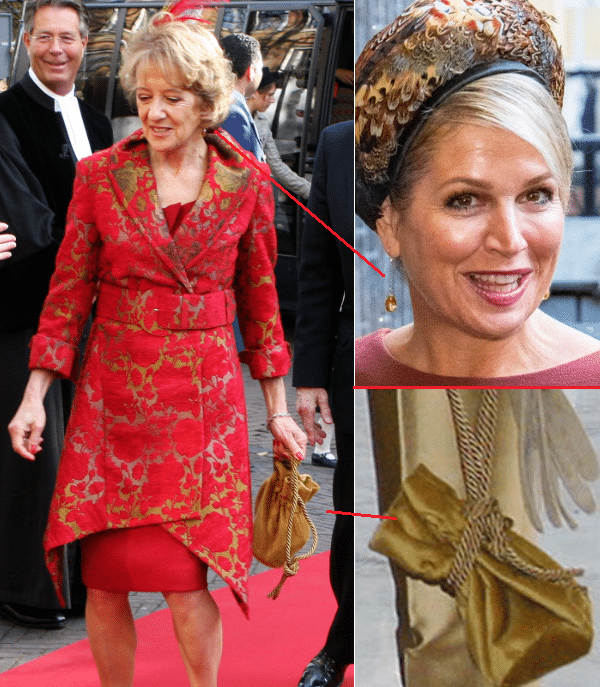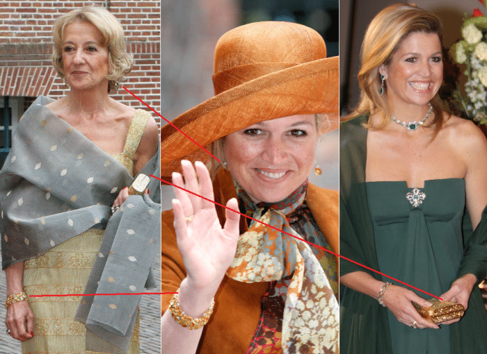 Toen Máxima’s moeder enkele jaren geleden Prinsjesdag bijwoonde vanaf de zijlijn, droeg ze costume jewelry. Gezien de stijl zou het me niet verbazen als ze uit Máxima’s boudoir komen, maar we hebben ze tot nu toe nog niet bij de koningin gezien. De tas en jurk wel.