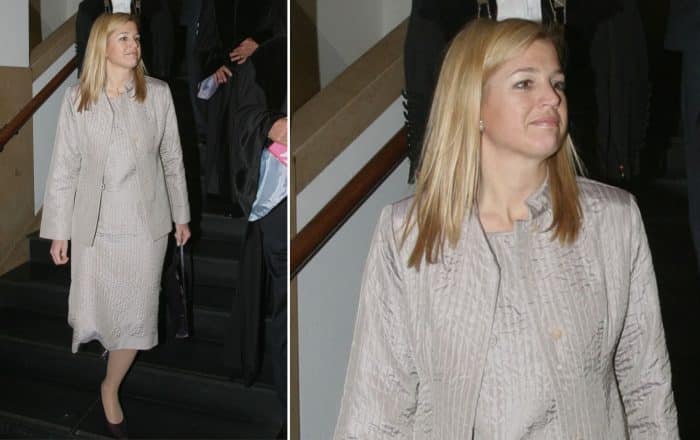 Goed, nummer 1. Ik wist gelijk welke outfit ik daar wilde plaatsen. Het gaat om een leverkleurig pak met verticale stiksels. De ontwerper heb ik nooit kunnen achterhalen en ik kan me zo voorstellen dat hij of zij dat graag zo laat. De vorm van het pak kun je onmogelijk een pasvorm noemen, want op geen enkel vlak sluit hij mooi aan of haalt hij Máxima naar boven. Het is een hobbezak in een nietszeggende kleur. Deze set mag linea recta naar de verkleedkist van Paleis Huis ten Bosch.