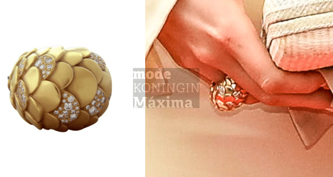 Amalia droeg een gouden ring met accenten van diamant. De ring is ontworpen door Pomellato en komt uit Máxima’s sieradenkistje. Hier lees je er meer over.